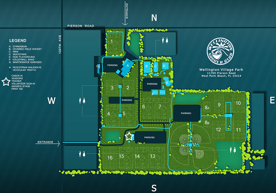 From I-95 - Exit Forest Hill Blvd west (approximately 7 miles) pass 441 to STRIBLING Way (Traffic Light). Turn left on STRIBLING Way. On Stribling Way at the fork in the road (Fairlane Farms Road) stay in the right lane. Next street is Pierson Road. Turn RIGHT on Pierson Road. Wellington Village Park is on the left side after you pass several business commerce centers.